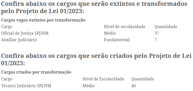 Projeto de lei transforma 44 cargos, atualmente vagos, de nível fundamental e médio em 46 cargos de técnico judiciário, de nível médio, a serem preenchidos por concurso. Haverá ainda a criação de 270 cargos comissionados. Há também mudanças de estrutura administrativa, com objetivo de aumentar produtividade do Judiciário cearense