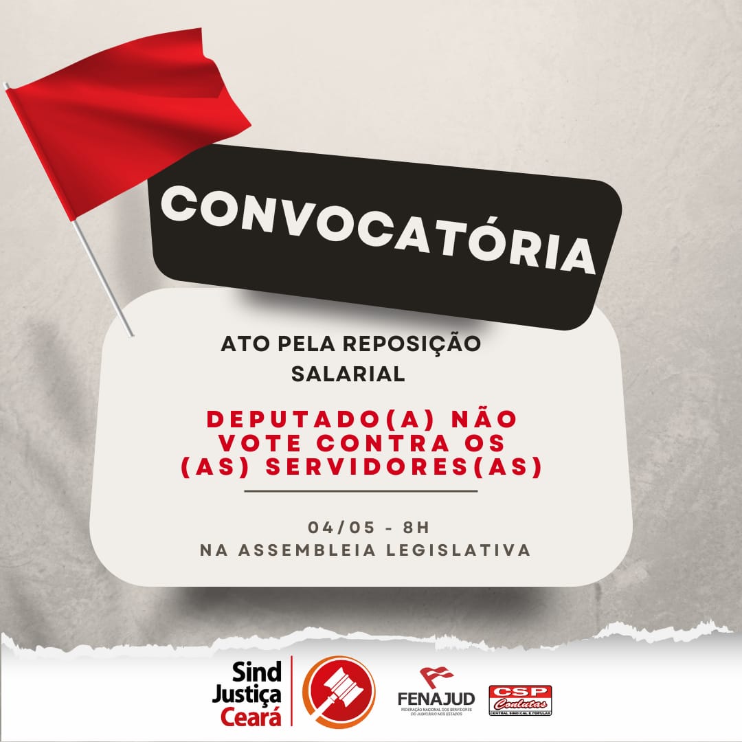 🚨URGENTE! | O SindJustiça Ceará convoca todos os trabalhadores para manifestação pela reposição salarial dos servidores estaduais que vai ocorrer nesta quinta-feira (04), em frente à Assembleia Legislativa do Ceará (Alece), às 8 horas.