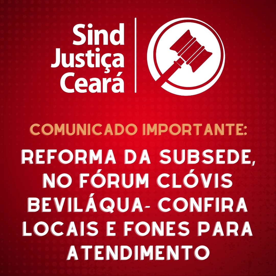 18 dez 2023 | A diretoria do Sindjustiça Ceará informa: A partir do dia 19/12 (terça-feira), não haverá atendimento na subsede da entidade, situada dentro do Fórum Clóvis Beviláqua.O local cedido ao sindicato é de propriedade do Tribunal Justiça, que deverá realizar uma reforma no recinto.A reforma não tem prazo determinado para término, razão pela qual os atendimentos da […]