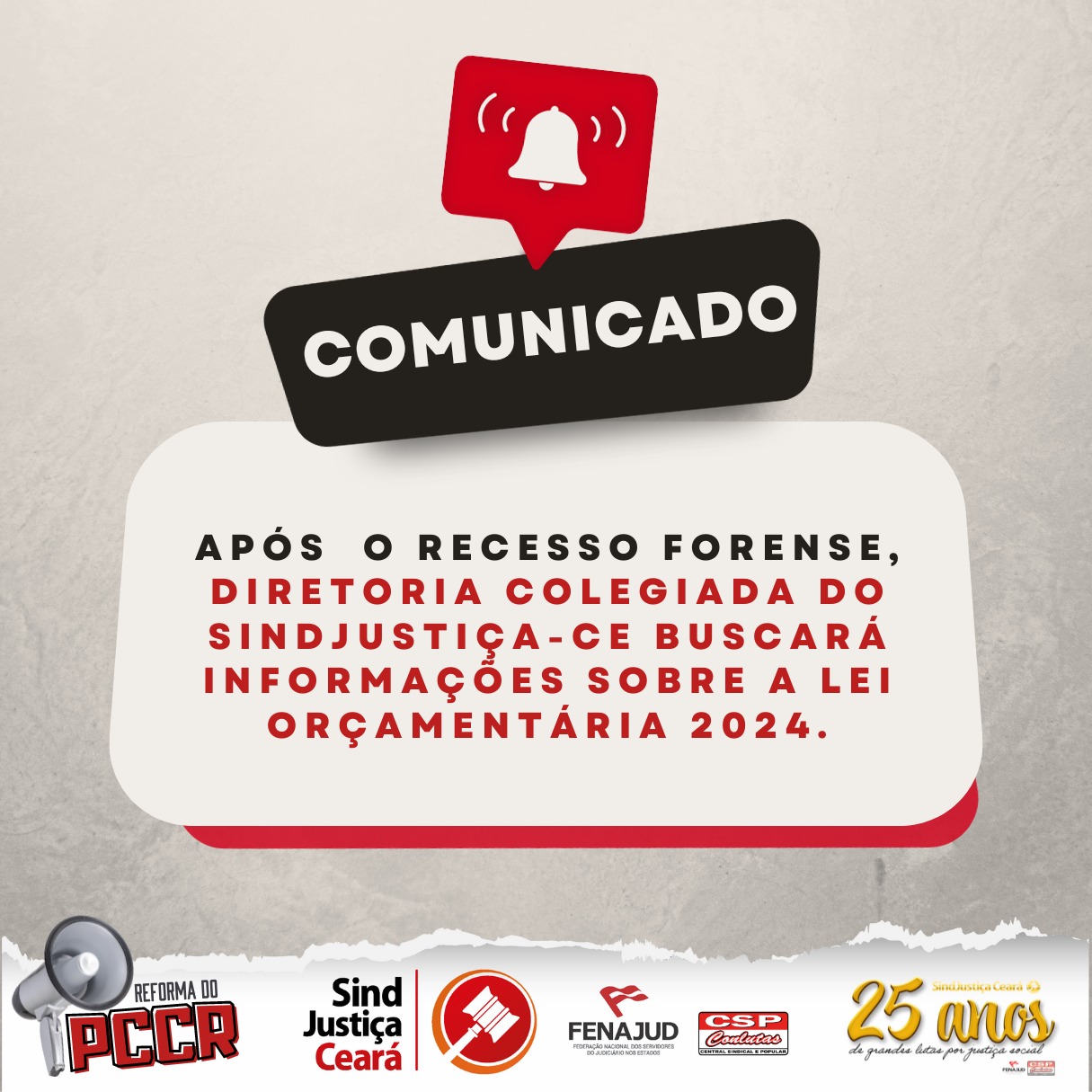 Em decorrência da recente aprovação da Lei Orçamentária Anual do estado para 2024, que contém o orçamento do Tribunal de Justiça do Estado do Ceará (TJCE), a diretoria colegiada do SindJustiça Ceará informa que buscará maiores detalhes junto à gestão do Tribunal logo após o recesso forense.