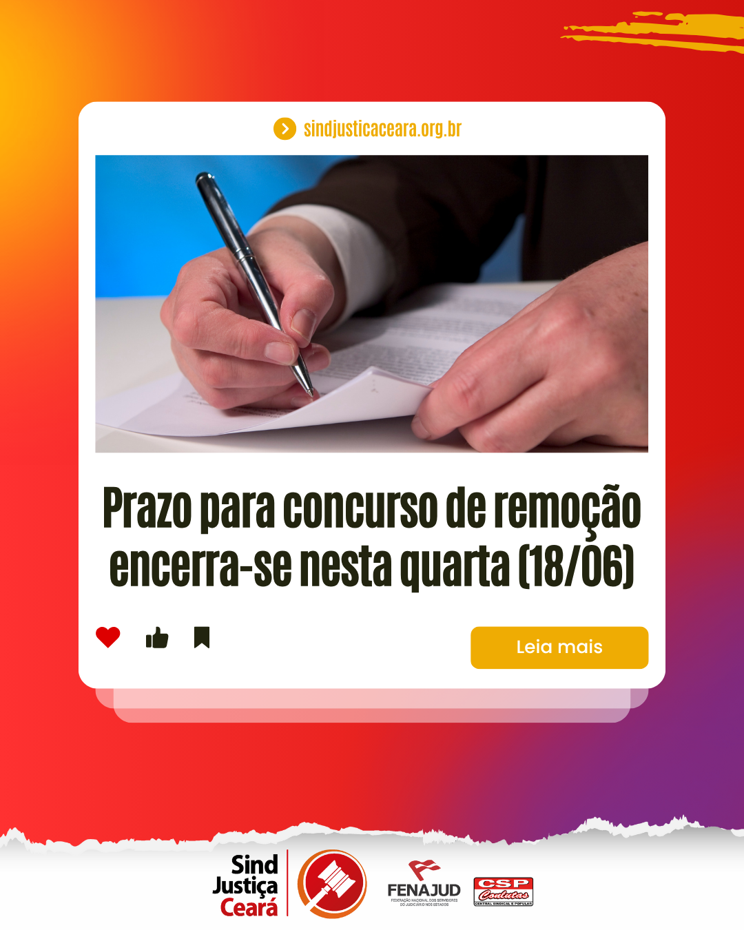 O SindJustiça Ceará informa que encerra-se nesta quarta-feira (18/06), às 23h59, o prazo para inscrição no Concurso de Remoção para os servidores do Quadro III – Poder Judiciário do Estado do Ceará dos Cargos Efetivos dos Níveis Superior, Médio e Fundamental da Área Judiciária.