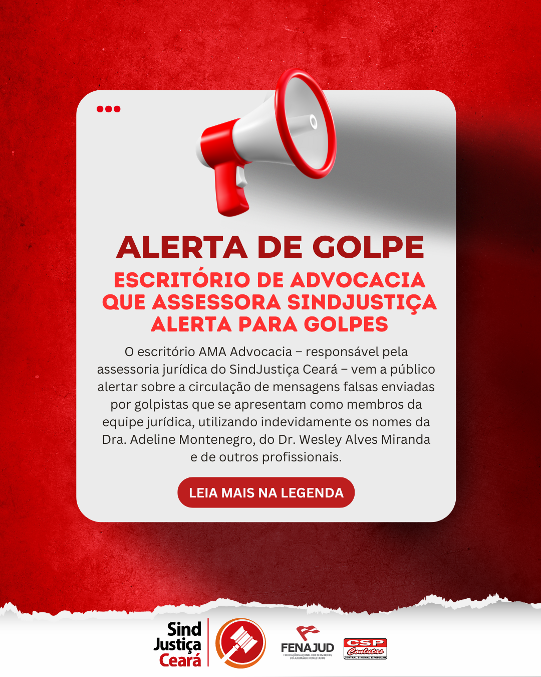 ⚠️ ALERTA DE GOLPE | O escritório AMA Advocacia – responsável pela assessoria jurídica do SindJustiça Ceará – vem a público alertar sobre a circulação de mensagens falsas enviadas por golpistas que se apresentam como membros da equipe jurídica, utilizando indevidamente os nomes da Dra. Adeline Montenegro, do Dr. Wesley Alves Miranda e de outros profissionais.