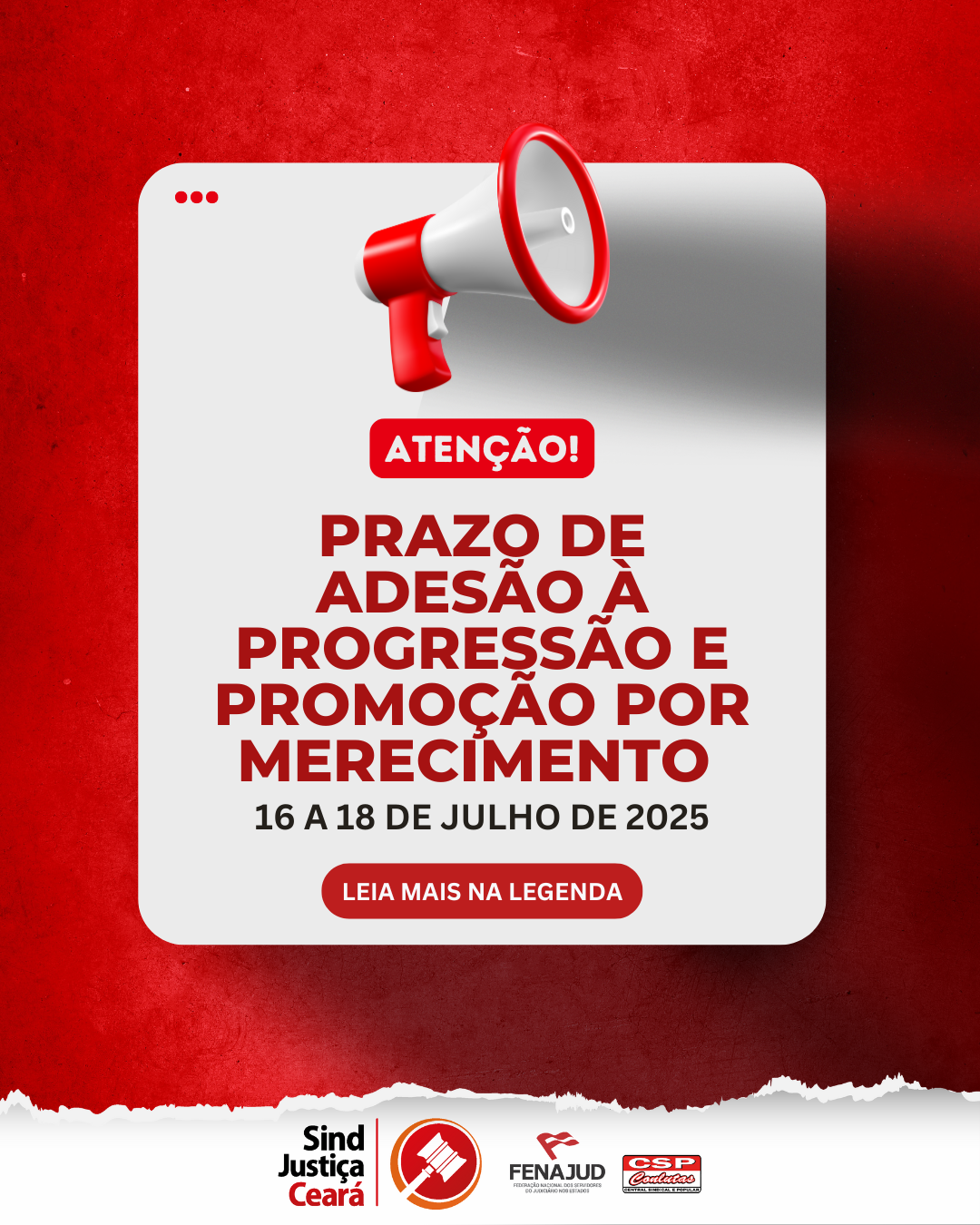 O SindJustiça Ceará alerta os servidores para o prazo de adesão à promoção e progressão funcional por merecimento, referente ao interstício de 1º de junho de 2024 a 31 de maio de 2025.