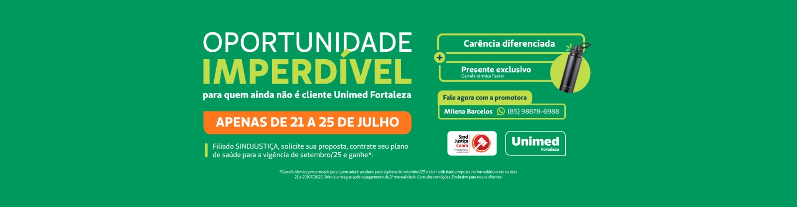 21 jul 2025 | 📅 Período exclusivo: 21 a 25 de julho ✅ Vigência a partir de 1º de setembro de 2025 🎁 Benefícios para filiados do Sindjustiça: ✔ Carência reduzida (condição diferenciada) ✔ Presente exclusivo: Garrafa Térmica Faster Não perca! Fale agora com nossa consultora especializada: 📞 Milena Barcelos 👉 WhatsApp: 85 98878-6988 (Clique para conversar diretamente!) PLANTÃO […]