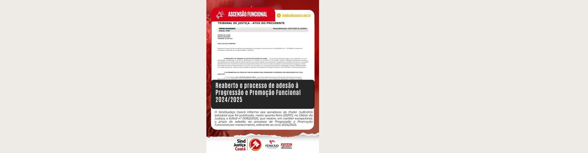 24 jul 2025 | O SindJustiça Ceará informa aos servidores do Poder Judiciário estadual que foi publicado, nesta quarta-feira (23/07), no Diário da Justiça, o Edital nº 00162/2025, que reabre, em caráter excepcional, o prazo de adesão ao processo de Progressão e Promoção Funcional por merecimento, referente ao ciclo 2024/2025. A decisão do presidente do Tribunal de Justiça do […]