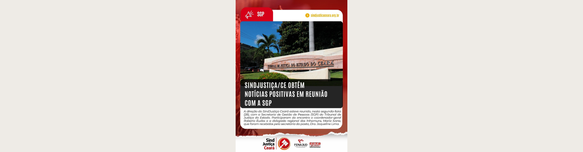 28 jul 2025 | A direção do SindJustiça Ceará esteve reunido, nesta segunda-feira (28), com a Secretaria de Gestão de Pessoas (SGP) do Tribunal de Justiça do Estado. Participaram do encontro o coordenador-geral Roberto Eudes e a delegada regional dos Inhamuns, Maria Ivone, que foram recebidos pela secretária da pasta, Dra. Jaqueline Lima. As atualizações são positivas para os […]