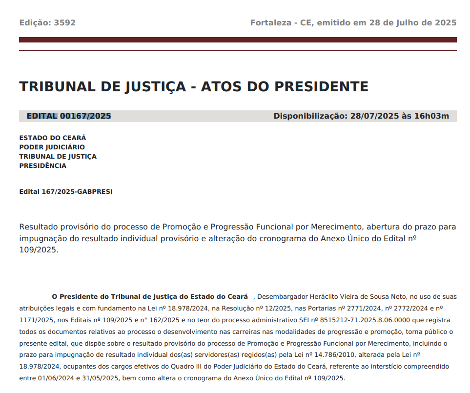 O Tribunal de Justiça do Estado do Ceará (TJCE) publicou, nesta segunda-feira (28/07), o Edital nº 167/2025, que traz o resultado provisório do processo de Promoção e Progressão Funcional por Merecimento dos(as) servidores(as) efetivos(as) do Quadro III do Judiciário estadual, referente ao período de 1º de junho de 2024 a 31 de maio de 2025.