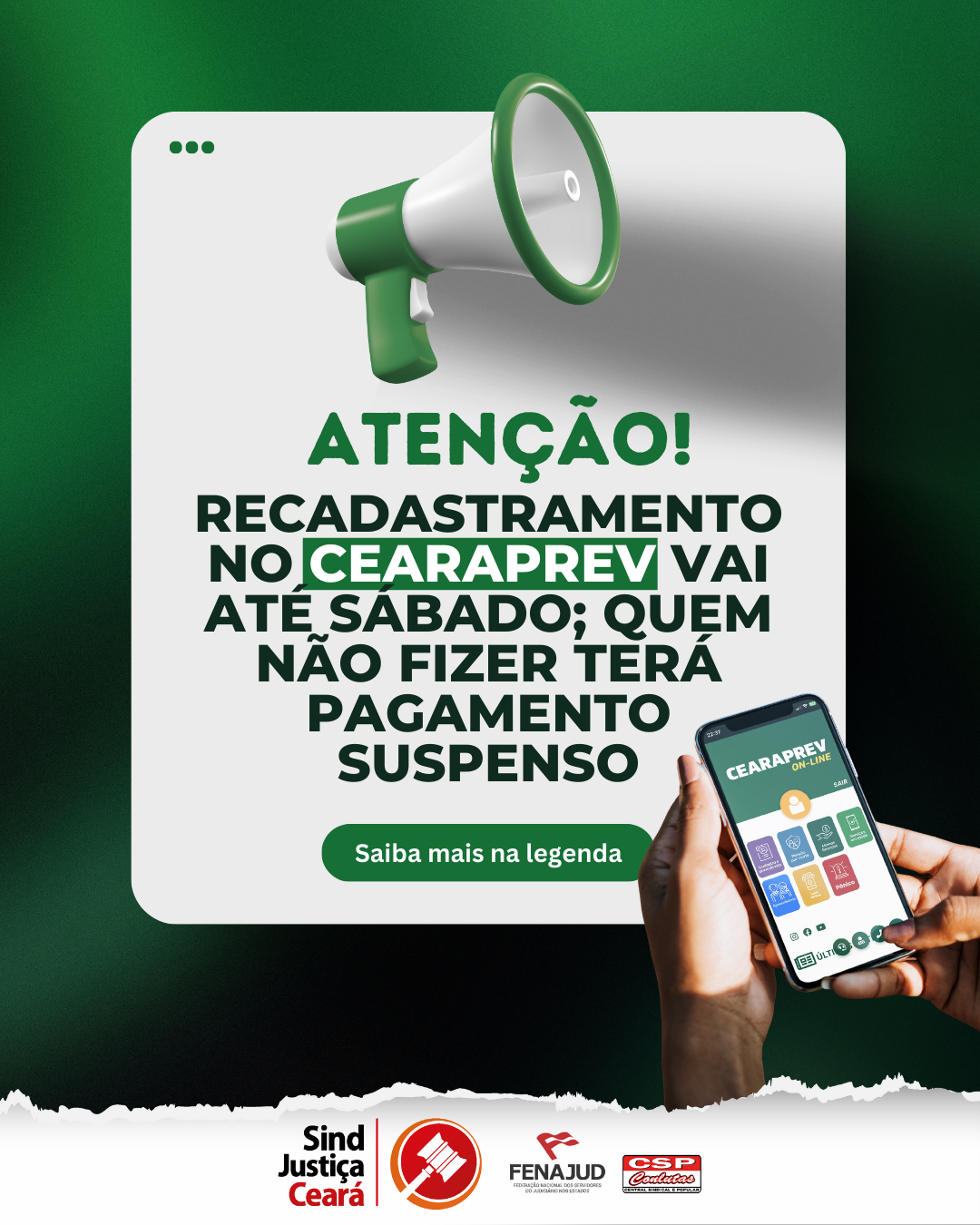 Atenção, servidores ativos que ainda não realizaram o seu recadastramento junto ao Cearaprev! O prazo final para a regularização vai até o dia 30 de agosto, neste sábado.