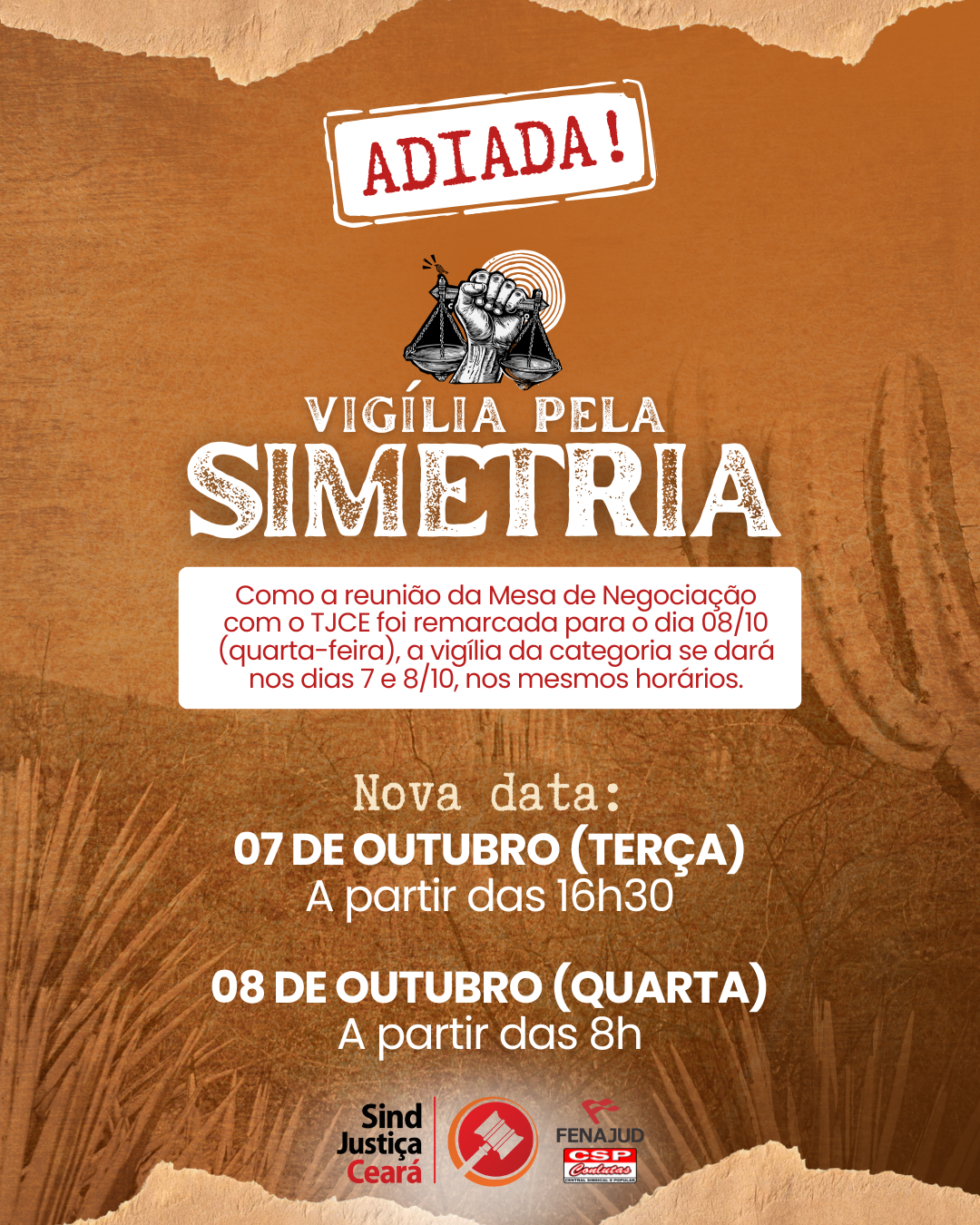 29 set 2025 | Informamos a todos os servidores e servidoras que a Vigília pela Simetria, marcada para os dias 30/09 e 01/10, está ADIADA . A decisão segue o adiamento da reunião da Mesa Permanente de Negociação do dia 01/10, à qual nossa mobilização estava vinculada. A luta pela simetria de direitos entre TJCe e MPCe, assim como […]