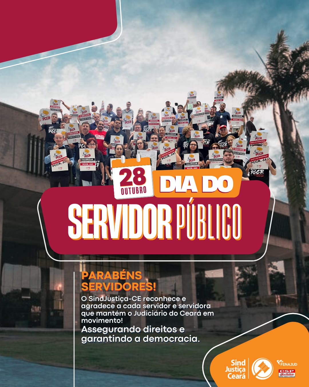 O SindJustiça-CE reafirma sua admiração, respeito e compromisso permanente com a valorização da categoria. Hoje celebramos vocês servidores e servidoras que são a base e a essência do Judiciário do Ceará.