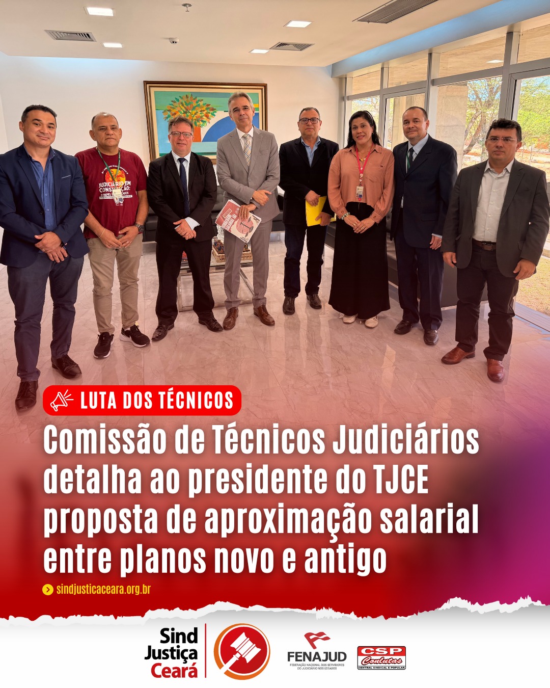 Após a reunião, o sindicato continuará acompanhando o pleito dos técnicos, atuando firmemente em defesa de todos os cargos do Judiciário cearense, buscando garantir justiça remuneratória e reconhecimento para toda a categoria.