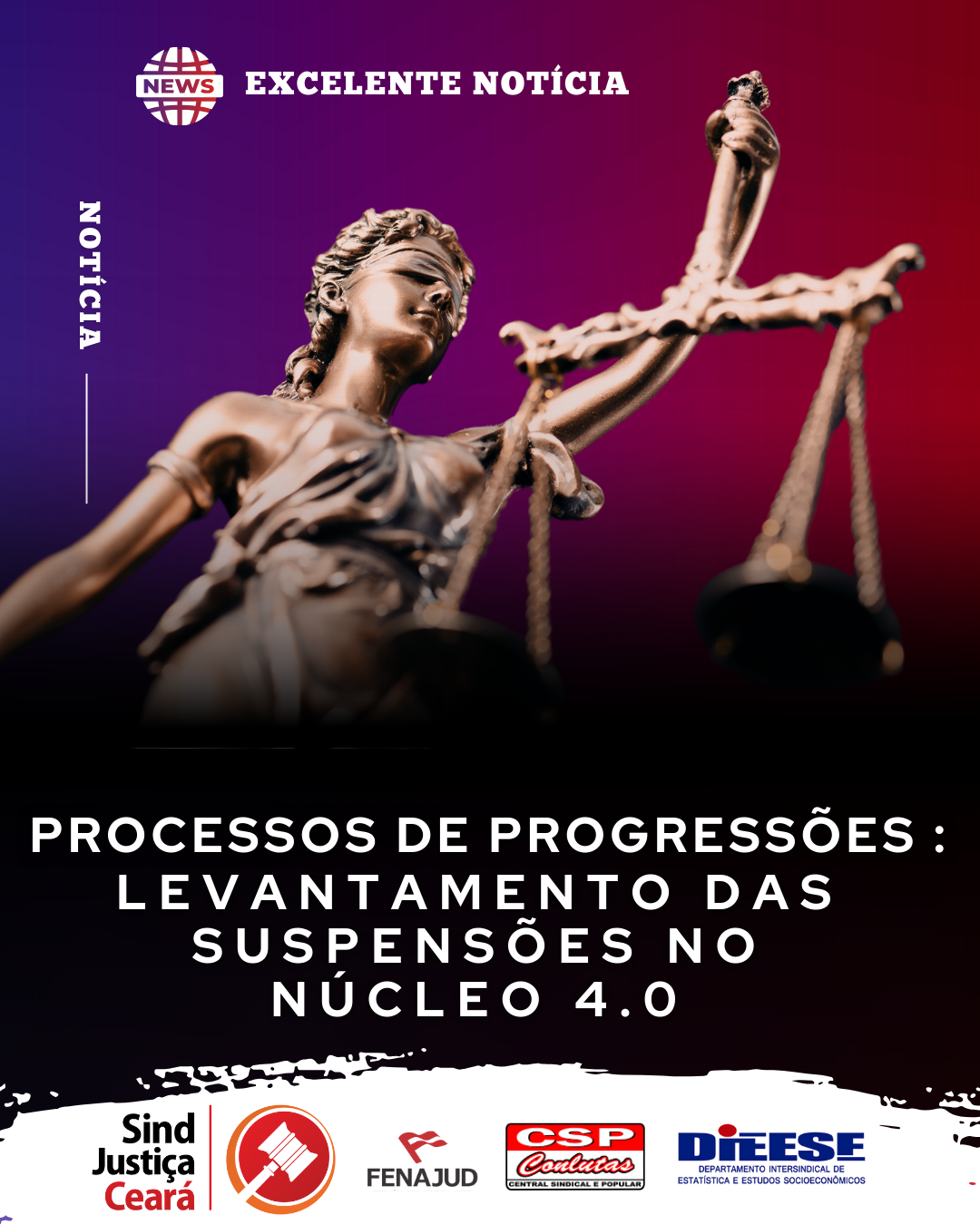 O SindJustiça Ceará informa aos filiados e filiadas que foi determinado o levantamento das suspensões dos cumprimentos de sentença que versam sobre progressões funcionais e que tramitam no Núcleo 4.0, os quais estavam paralisados em razão da afetação do Tema 1.169/STJ.