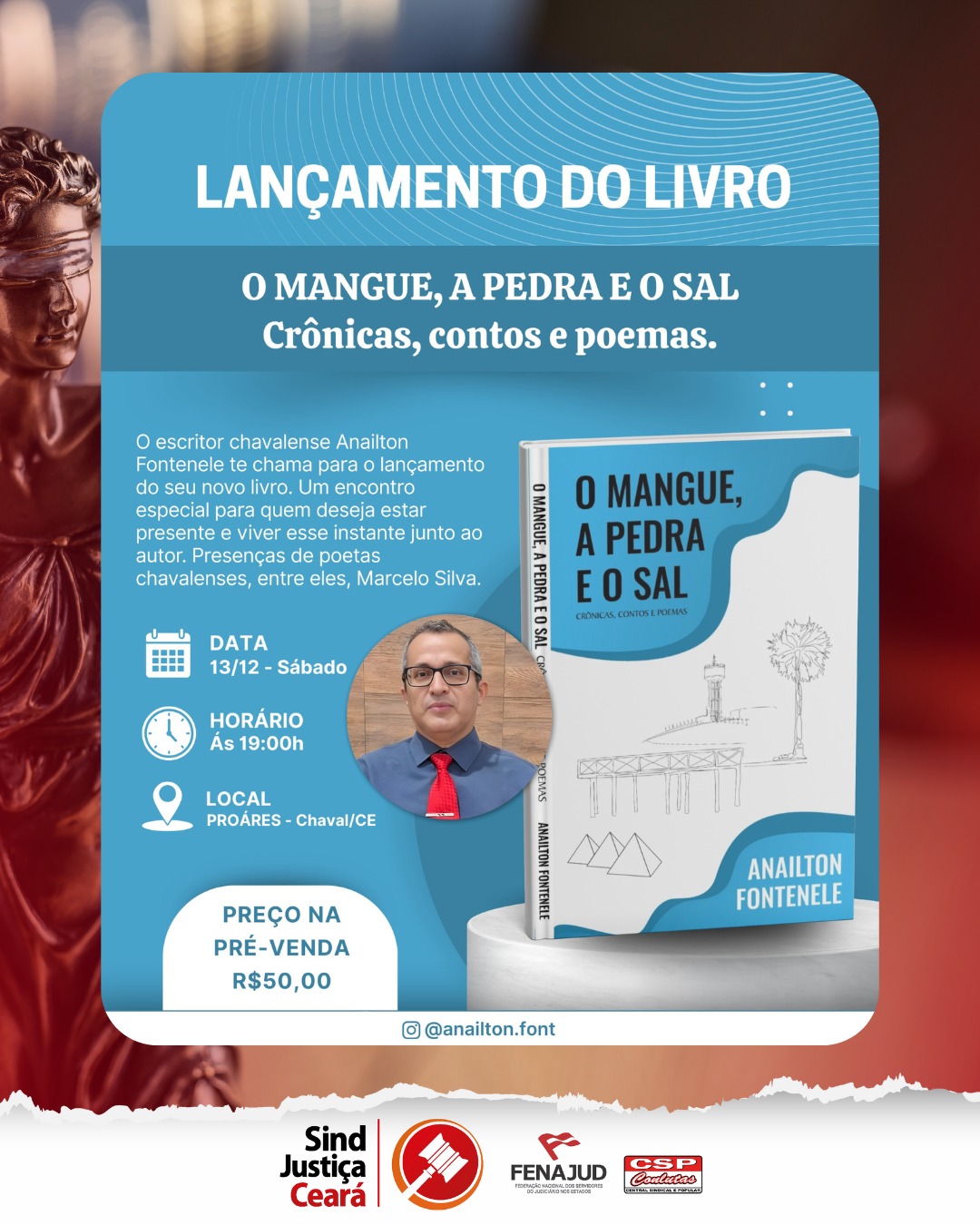 O município de Chaval, no Ceará, será o palco de um importante evento cultural no próximo dia 13 de dezembro. O auxiliar judiciário do Tribunal de Justiça do Ceará (TJCE), Anailton Fontenele, fará o lançamento de sua segunda obra literária, a coletânea “O Mangue, a Pedra e o Sal”. A obra reúne crônicas, contos e poemas, marcando o retorno do servidor à cena literária. A iniciativa foi calorosamente saudada pela direção colegiada do Sindjustiça (Sindicato dos Servidores da Justiça do Ceará), que reafirmou seu papel em defesa da cultura.