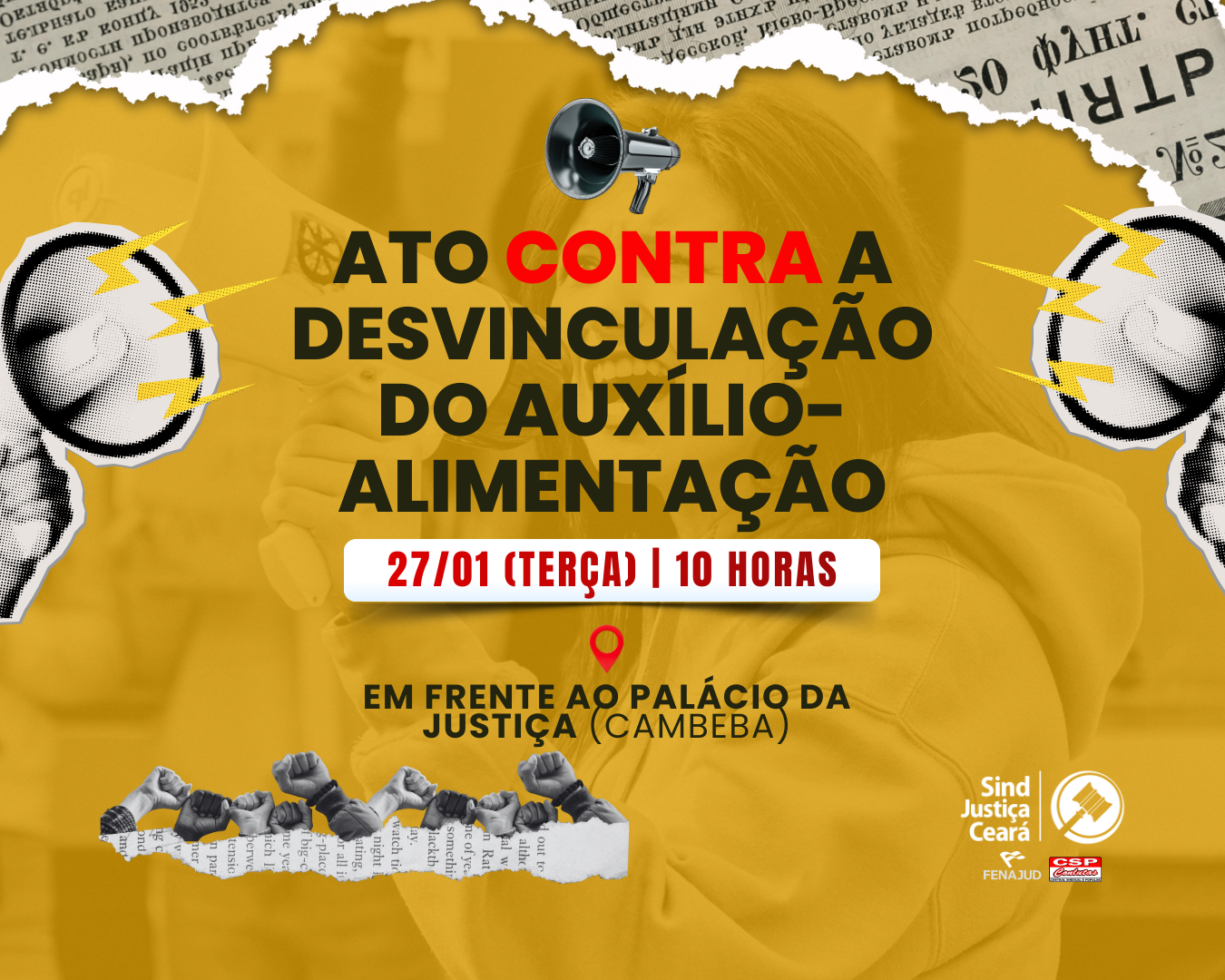 21 jan 2026 | Servidores e servidoras, é hora de nos mobilizarmos contra a desvinculação do auxílio-alimentação.Dia 27 de janeiro (terça-feira), às 10h, em frente ao Palácio da Justiça. A defesa dos nossos direitos depende da nossa presença. Compareça e lute contra essa injustiça! O SindJustiça Ceará protocolou dois requerimentos no TJCE defendendo a valorização dos servidores e a […]