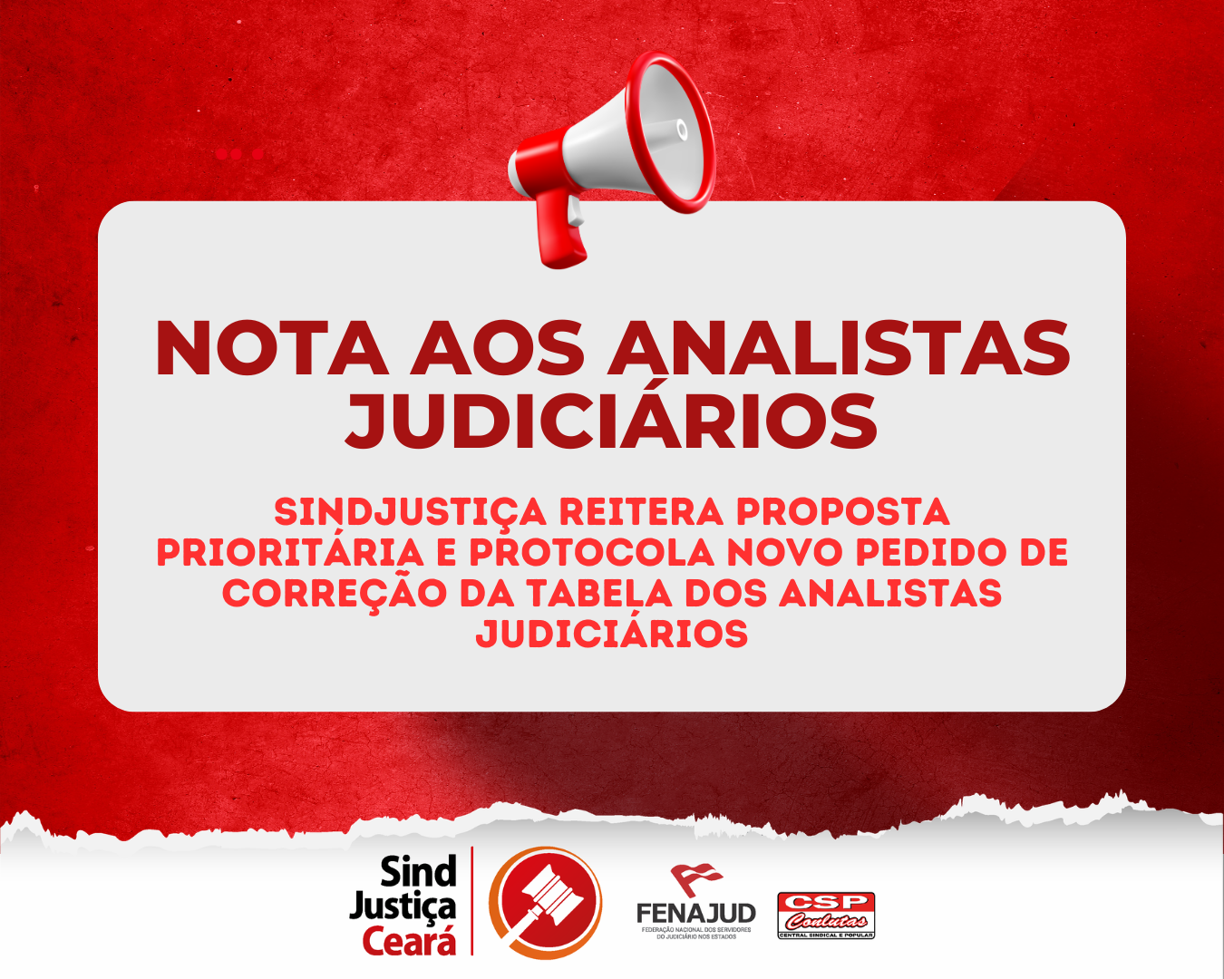 Reforçamos, ainda, o chamado para que os Analistas Judiciários somem forças com os demais cargos de nível fundamental e médio na campanha pela equiparação das tabelas no percentual de 5%, fortalecendo uma luta coletiva que beneficia todo o conjunto dos servidores.