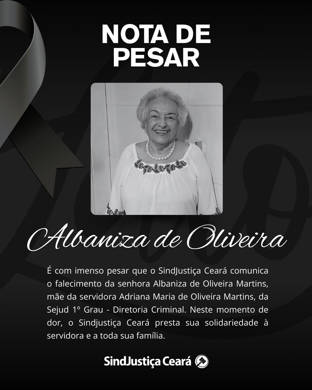 É com profundo pesar que a Diretoria Colegiada do SindJustiça Ceará comunica o falecimento da senhora Maria Yolanda Oliveira Bino, nossa querida Yozinha. Manifestamos nossas sinceras condolências a todos os familiares e amigos neste momento de dor imensurável, desejando que encontrem a força e a serenidade necessárias diante desta perda.